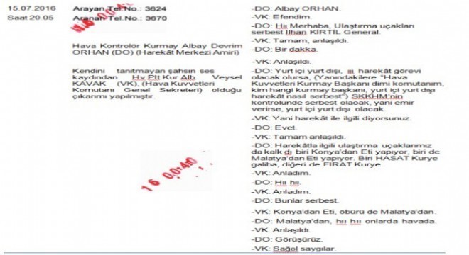 “Saat 20.01'de; detayları harekat özet defterinden anlaşılacağı gibi; Hava Kuvvetleri Harekat Merkezi'nden yüzbaşı Caner Gökçeoğlu tarafından Silahlı Kuvvetler Harekat Merkezi'nin emriyle ulaştırma uçaklarında uçuşun serbest olduğu bilgisinin geçildiği,