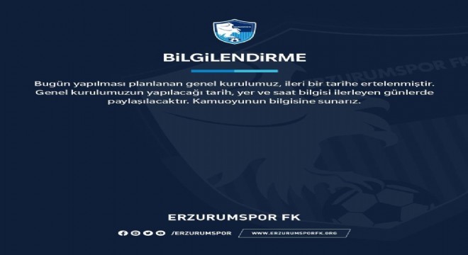 Erzurumspor Kulübü’nden bu gün yapılan yazılı açıklamada ise; “Bu gün yapılması planlanan genel kurulumuz, ileri bir tarihe ertelenmiştir. Genel Kurulumuzun yapılacağı tarih, yer ve saat bilgisi ilerleyen günlerde paylaşılacaktır. Kamuoyunun bilgisine sunarız.” İfadelerine yer verildi.