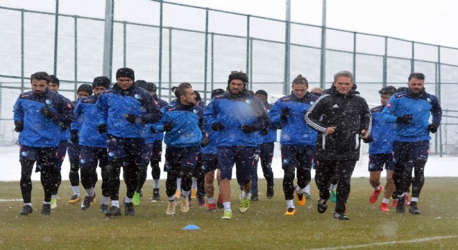 Erzurumspor Tesislerinde yoğun kar yağışı altında düz koşu, 5-2 dar alanda top kapma ve çift kale maç yaparak antrenmanı tamamlayan mavi-beyazlılar antrenmandan sonra, kartopu oynadılar.