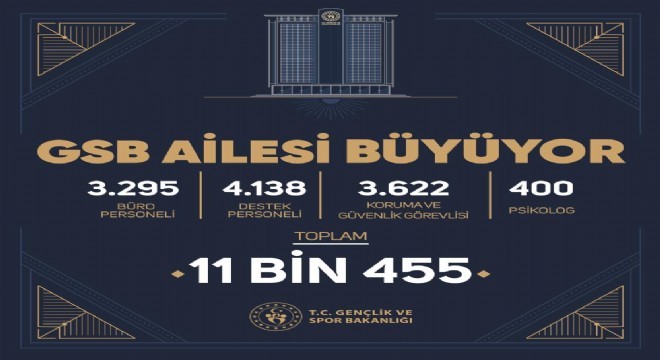Gençlik ve Spor Bakanı Osman Aşkın Bak, sosyal medya hesabı üzerinden, Gençlik ve Spor Bakanlığı’na sözleşmeli olarak personel alımı yapacaklarını duyurdu. Personel alımı ile ilgili detayların en kısa sürede Resmi Gazete’de ve ‘gsb.gov.tr’ sayfasında yayımlanacağı bilgilerine yer veren Bakan Bak, 3 bin 295 büro personeli, 4 bin 138 destek personeli, 3 bin 622 koruma ve güvenlik görevlisi, 400 psikolog olmak üzere 11 bin 455 personel alımı yapılacağını açıkladı.
