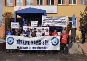 Türkiye Kamu-Sen Erzurum Temsilciliği "eşit işe eşit ücret" yasasına tepkilerini göstermek için eylem yaptı. Vergi Dairesi önünde basın açıklaması yapan Türkiye Kamu-Sen Erzurum İl Temsilcisi Müfit Bayraktar, haklarını aramaya devam edeceklerini söyledi.